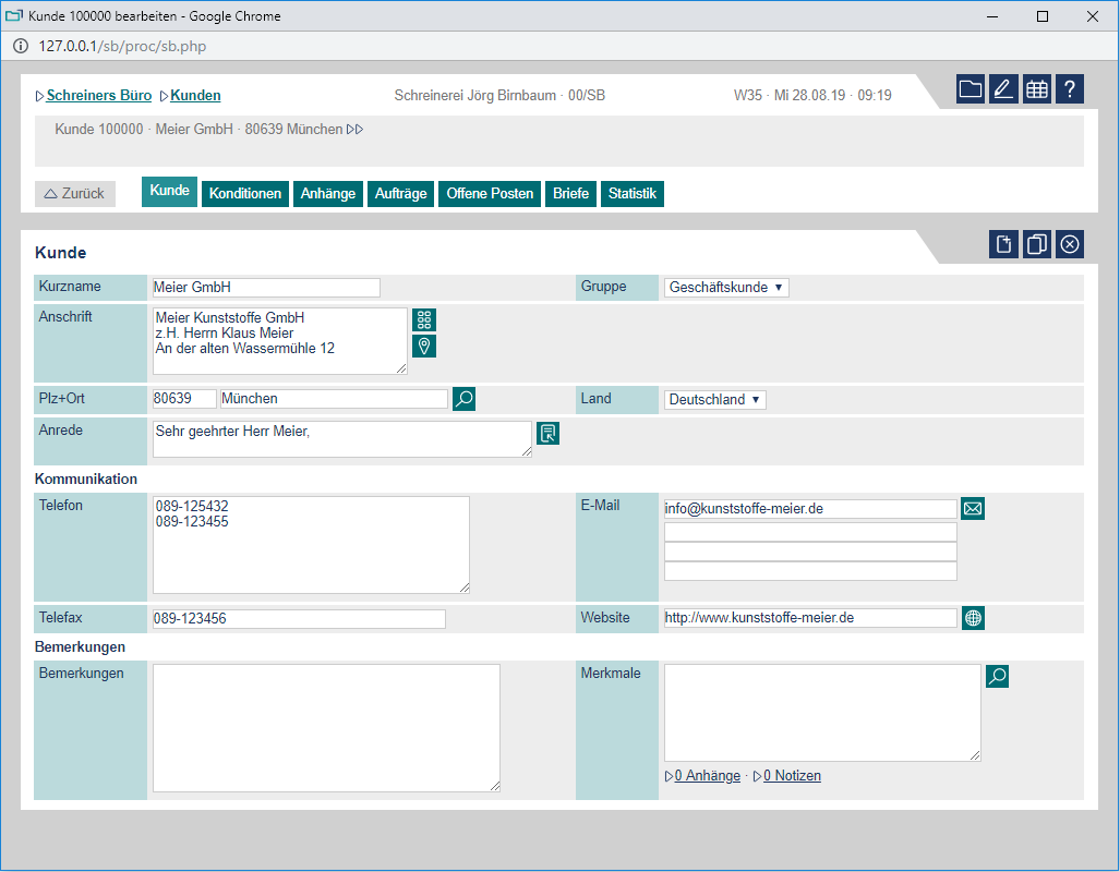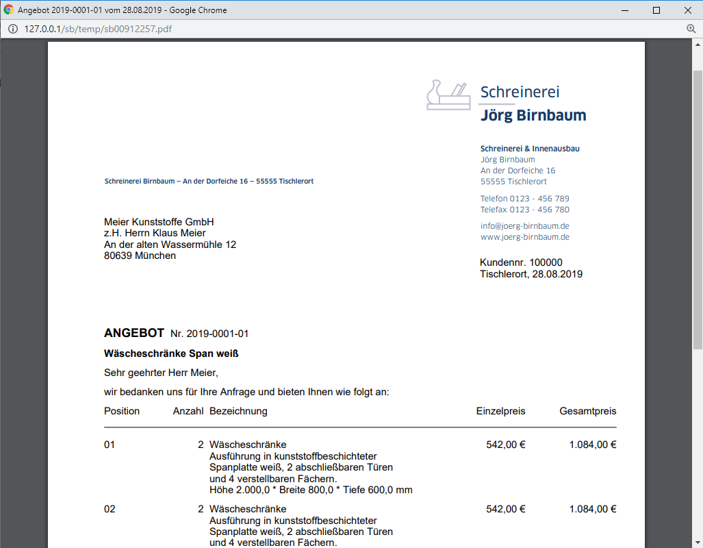 Schreiners Büro läuft direkt in Ihrem Browser. Hier können Sie sich Schreiners Büro als voll funktionsfähige Demo ansehen und in allen Funktionen (Angebot bis Rechnung, Zeiten buchen, Kalkulation usw.) ausgiebig testen.